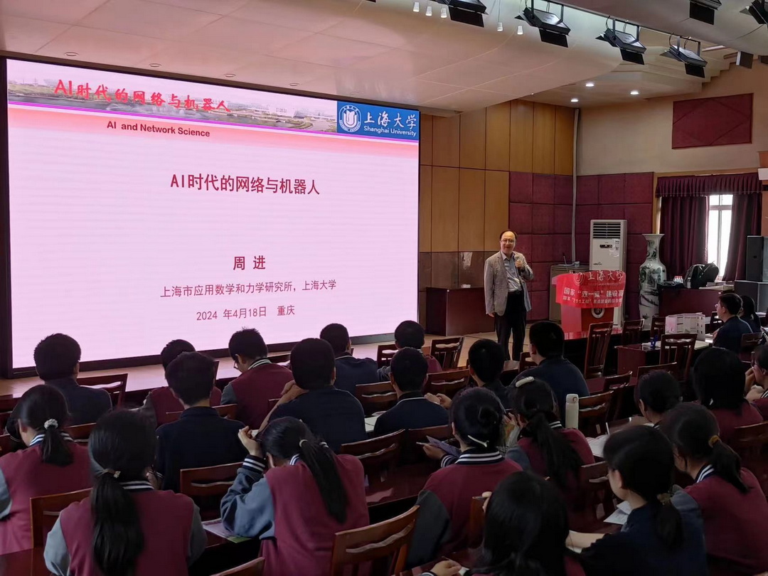 2024年4月18日,上海大学力学与工程科学学院,上海市应用数学和力学研究所教授、博士生导师周进老师莅临重庆八中沙坪坝校区,为高2026级的同学们带来主题为“AI时代的网络与机器人”的讲座。