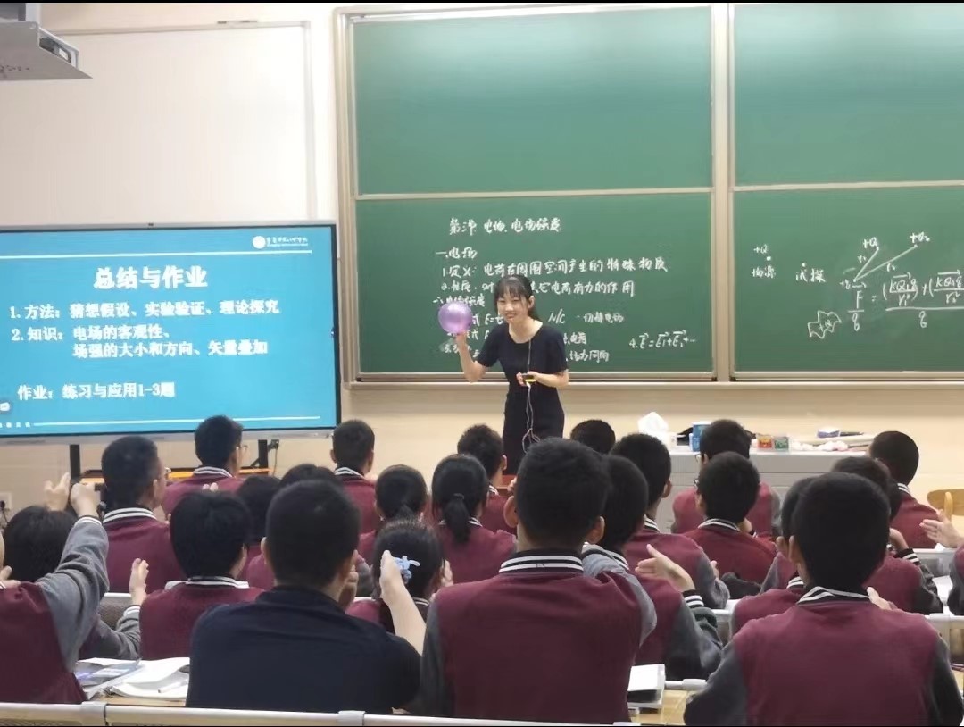 李松柏老师也以创新实验为情景,围绕范式起电机电场展开课堂。首先通过范式起电机实验说明了场的存在,引出场的概念。接下来类比以前的学习万有引力的学习情景,让重力场强度的学习过程再现,然后再将场的强度概念迁移到电场领域,引导学生推导电场强度表达式,强调电场只与场源电荷有关而与试探电荷无关。