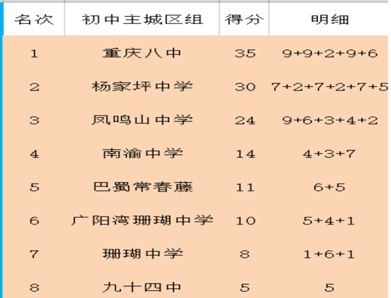 重庆八中乒乓球队在教练石旭赞和魏志豪带领下,通过顽强拼搏,取得了初中组总共4枚金牌中的3枚,获得了初中组团体总分第一名的好成绩,乒乓球队在仅有12名队员并且以小打大的情况下,不畏困难、奋勇拼搏,最终取得优异成绩,该成绩是渝北区学校参加重庆市教委主办中小学生乒乓球比赛所获得的历史最好成绩。石旭赞和魏志豪教练员获得重庆市优秀教练员证书。