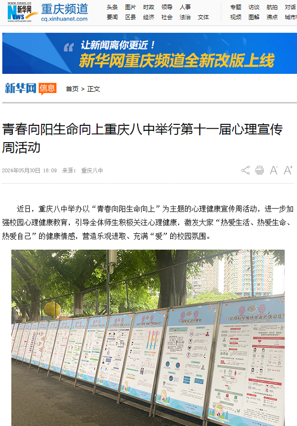 近日,重庆八中举办以“青春向阳生命向上”为主题的心理健康宣传周活动,进一步加强校园心理健康教育,引导全体师生积极关注心理健康,激发大家“热爱生活、热爱生命、热爱自己”的健康情感,营造乐观进取、充满“爱”的校园氛围。