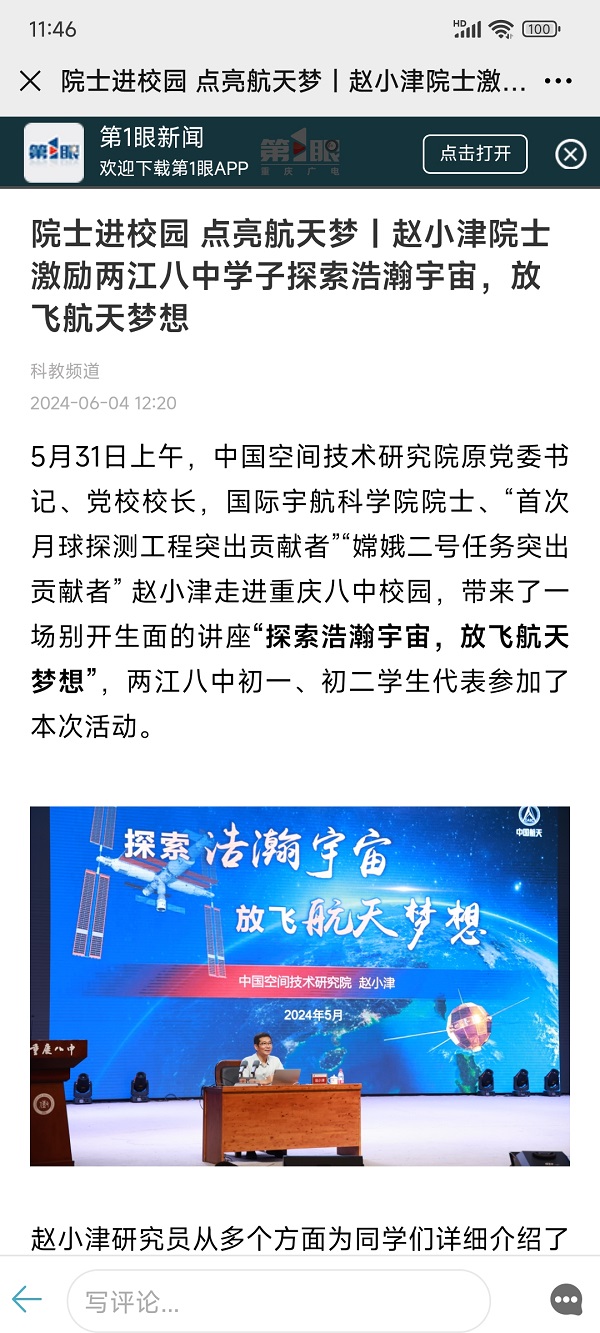 5月31日上午,中国空间技术研究院原党委书记、党校校长,国际宇航科学院院士、“首次月球探测工程突出贡献者”“嫦娥二号任务突出贡献者” 赵小津走进重庆八中校园,带来了一场别开生面的讲座“探索浩瀚宇宙,放飞航天梦想”,两江八中初一、初二学生代表参加了本次活动。